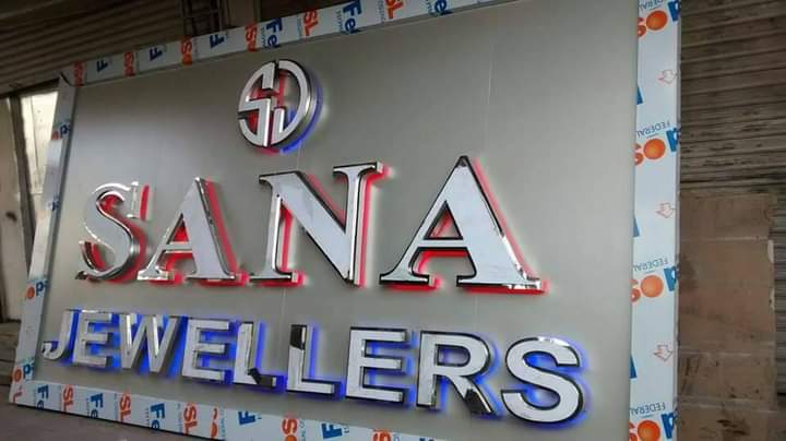 Custom metal, acrylic and wooden signboards — designed & installed end-to-end.